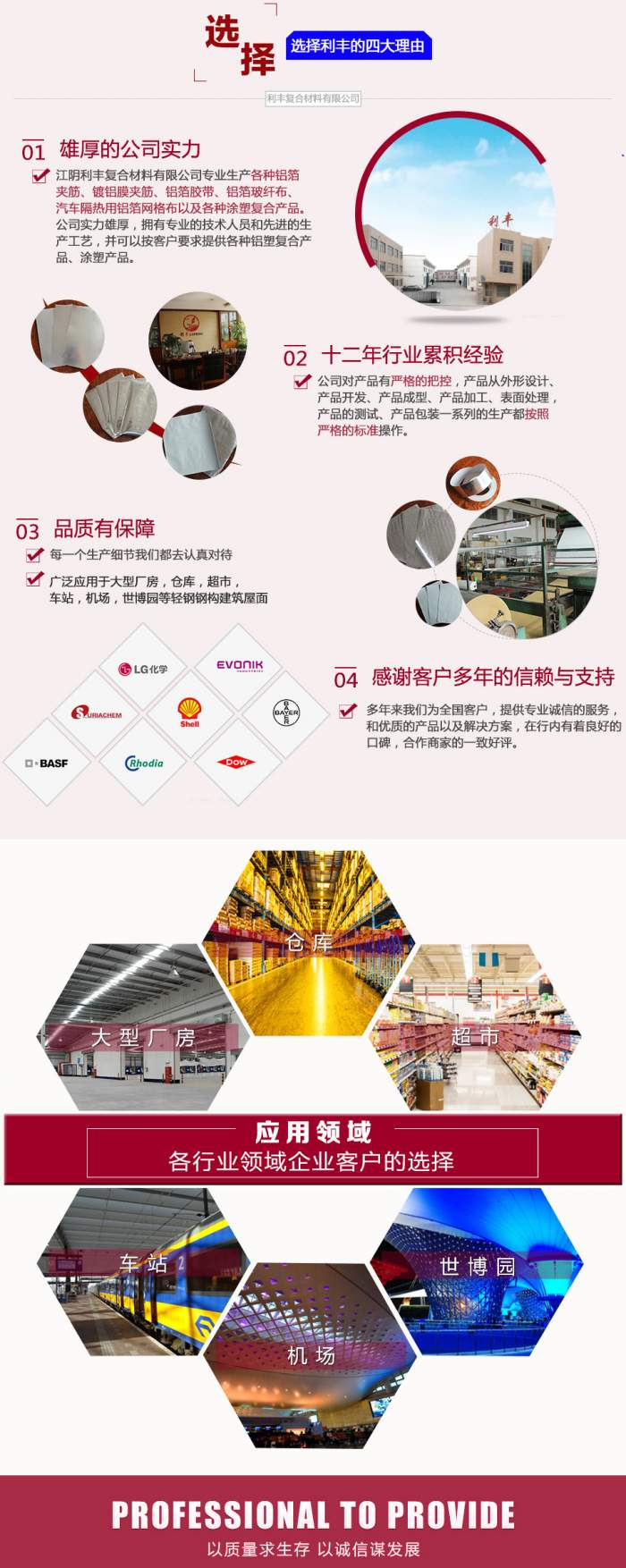 公司不斷引進國內(nèi)外先進技術(shù)設(shè)備,供應各種保溫隔熱貼面,專業(yè)生產(chǎn)單、雙面夾筋鋁箔,各種規(guī)格鋁箔牛皮紙,鋁箔玻纖布,鋁箔網(wǎng)格布,鋁箔編織布,汽車隔熱墊用鋁箔,聚丙烯夾筋,白膜三合一,二合一,PVC白膜夾筋以及各類鍍鋁膜貼面。